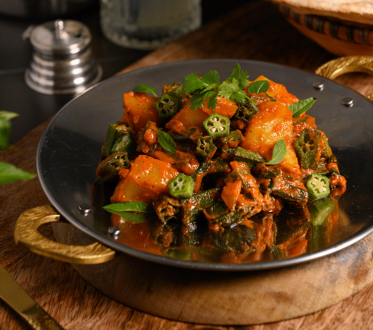This dry-style sabzi features stir-fried okra and potatoes tossed in mustard seeds, turmeric, and a house blend of Indian spices. It’s crisp, earthy, and full of texture — a wholesome vegetarian dish that pairs beautifully with roti or lemon rice.